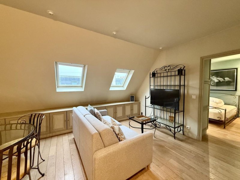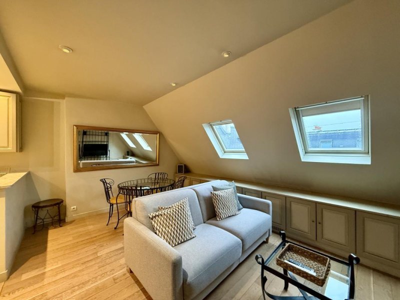 Le séjour, baigné de lumière grâce à ses velux, propose un espace cosy avec un aperçu sur la Tour Eiffel.