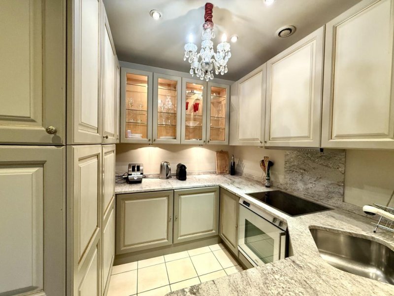 La cuisine ouverte, au style classique et chic, est entièrement équipée avec des matériaux de qualité.