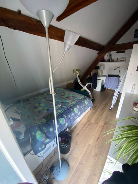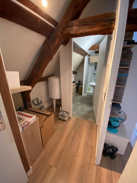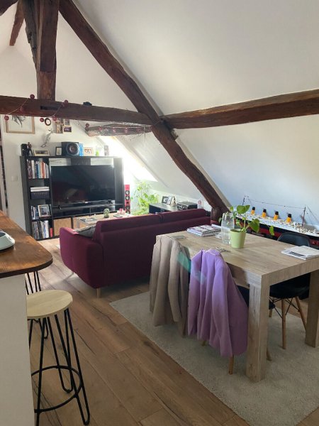Ce charmant appartement est situé sous les toits et se compose d'une entrée donnant sur un joli séjour avec poutres apparentes et son espace cuisine, d'une chambre et d'une salle d'eau avec toilettes.