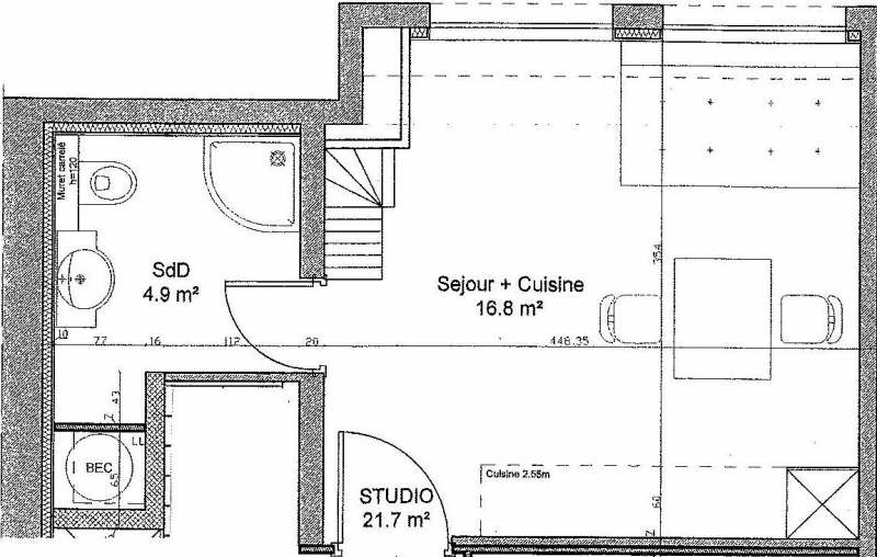 Il comprend une pièce à vivre avec parquet, une kitchenette équipée (plaques de cuisson - four - hotte aspirante - réfrigérateur) et une salle d'eau.