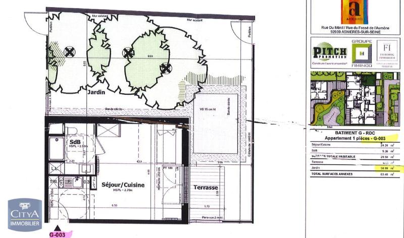 En location : à ASNIERES SUR SEINE (92600) découvrez cet appartement 1 pièce de 29,5 m². Il inclut une pièce principale avec cuisine ouverte, une salle de bains avec wc et un jardin.