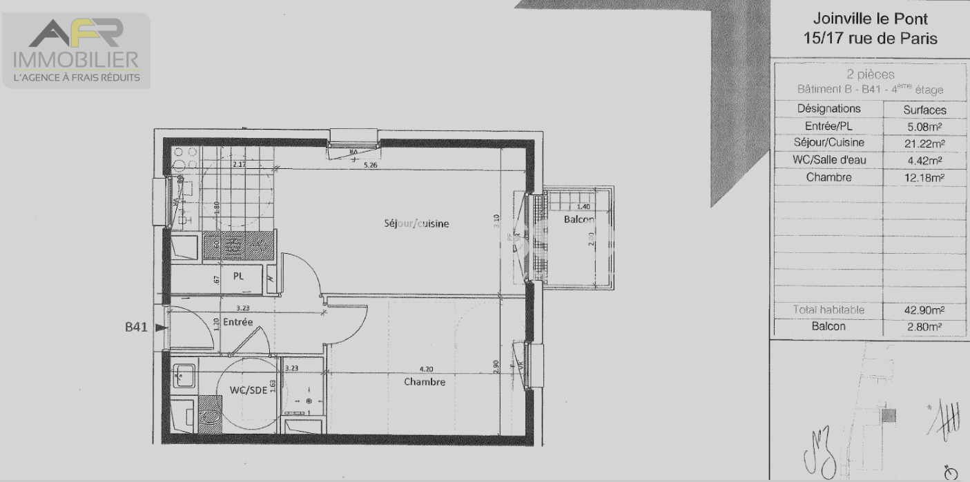Au 21 Rue de paris 94340 JOINVILLE LE PONT, AFR Immobilier vous propose un appartement de type T2 de 42.60 m² comprenant: Entrée avec placard, séjour, cuisine américaine, une chambre, salle d'eau avec WC. Balcon. une place parking privé en sous-sol. Chauffage, eau chaude et eau froide inclus dans les charges. Fibre. Lumineux et calme. Proche toute commodités. A NE APS RATER !!