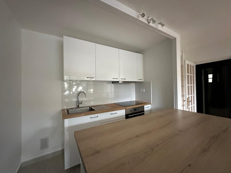 La cuisine semi-équipée (plaque de cuisson, four et hotte), est ouverte sur le séjour.