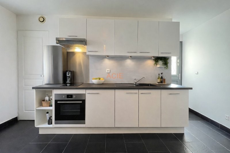 Entrée, grande pièce principale avec cuisine ouverte et aménagée, une chambre avec rangement, salle d'eau moderne et wc.