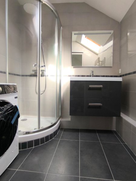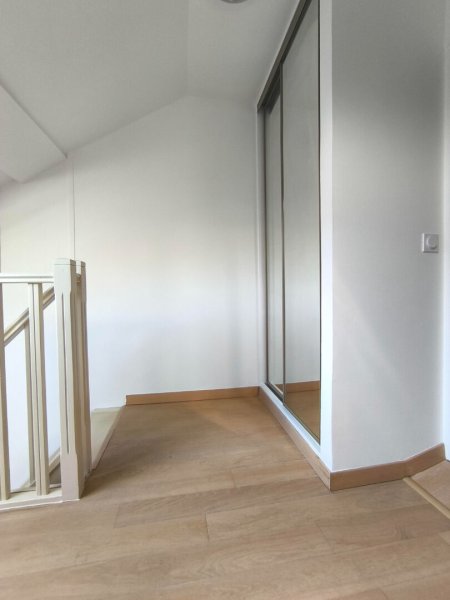 Au second niveau, un palier avec placard, une chambre avec grand placard et bureau, une salle de douche avec machine à laver.