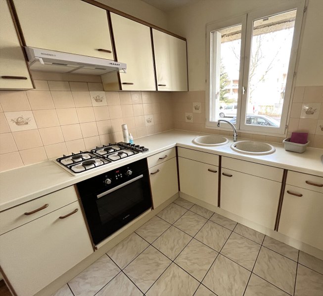 Quartier Sourderie Sud, appartement 3 pièces, en rez-de-jardin comprenant : entrée, séjour exposé sud donnant sur un jardin d'environ 60 m2 avec terrasse au calme donnant sur jardin clos de la résidence, cuisine aménagée et équipée, dégagement avec placard, 2 chambres avec grands placards, salle de bains, wc indépendant.