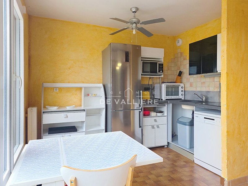 Cuisine équipée : grand frigo congélateur, lave-vaisselle, machine à laver