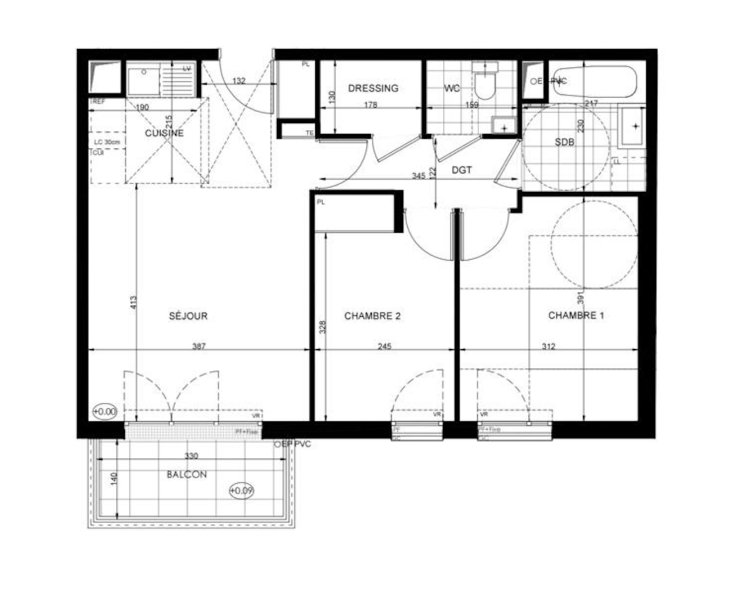 Il comprend un Séjour de 20m2 ouvert sur la Cuisine, 2 Chambres, un espace Dressing, une Salle de Bain et des WC séparés.