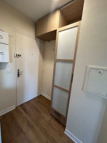 L'appartement de 41.67 m² comprend : une entrée avec placard, un séjour donnant sur une cuisine semi-ouverte et aménagée, un dégagement donnant accès à une salle de bains avec WC et une chambre avec placard.