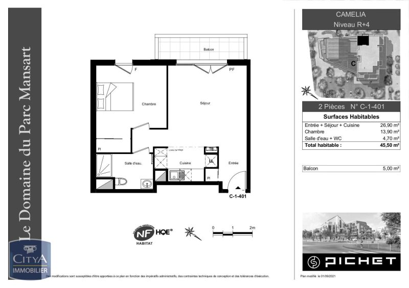 L'appartement se compose de deux pièces, offrant un agencement fonctionnel et optimisé. Le salon, lumineux et accueillant, constitue un espace de vie parfait pour se détendre ou recevoir des amis. La chambre, quant à elle, est suffisamment spacieuse pour accueillir un lit double et dispose de rangements pratiques.
