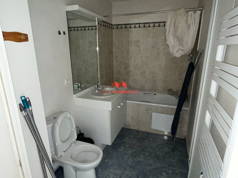 Un appartement meublé comprenant une entrée avec rangements, une salle de bains, une cuisine aménagée et équipée ouverte sur le séjour donnant sur un grand balcon/terrasse avec une vue dégagée.