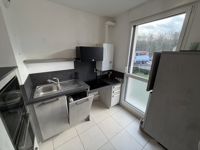 Entrée avec salle d'eau et WC, chambre, séjour lumineux avec balcon, cuisine ouverte entièrement équipée.