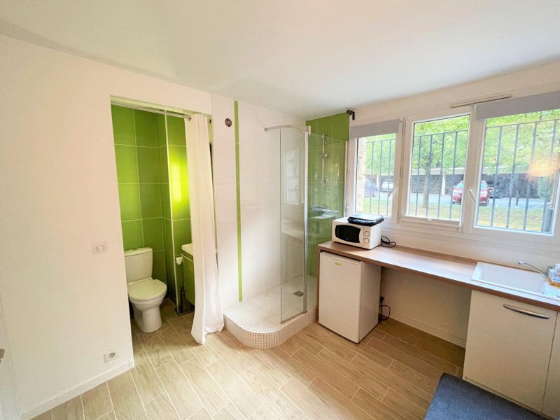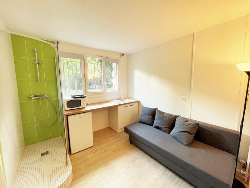 À seulement 12min à pieds de la station "ST GERMAIN EN LAYE" (RER A), à 700m du Tramway (T2) et à proximité direct du square et de la PLACE LOUIS XIV, dans une charmante copropriété BIEN ENTRETENUE avec JARDIN COMMUN, au RDC, un STUDIO EN TRES BON ÉTAT de 9,21m² composé comme suit : une entrée donnant sur la pièce de vie exposée OUEST donnant directement sur le JARDIN COMMUN, une kitchenette totalement ÉQUIPÉE ET AMÉNAGÉE (Four micro-ondes, Frigo, Lave linge, Plaques chauffantes), un coin douche ainsi qu'un WC séparé.