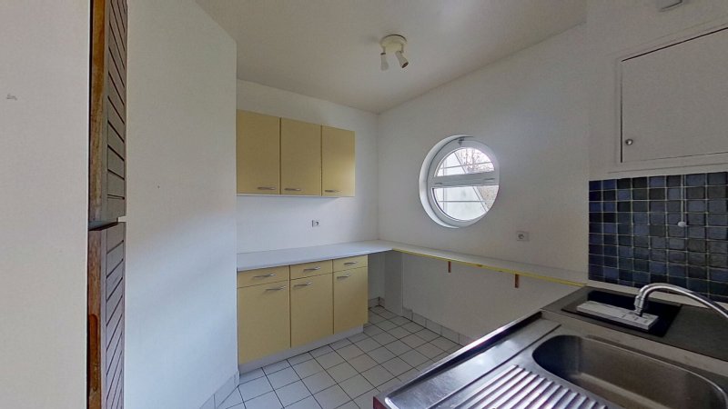La pièce principale s'ouvre sur l'extérieur par de larges baies vitrées apportant une clarté constante. L'appartement dispose également d'une cuisine séparée et fonctionnelle, dotée de nombreux rangements et d'une charmante fenêtre ronde.