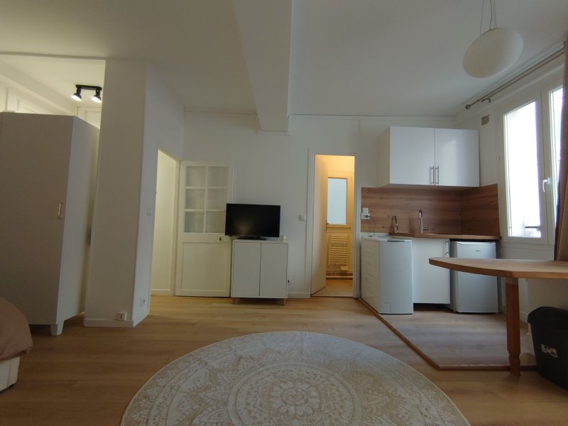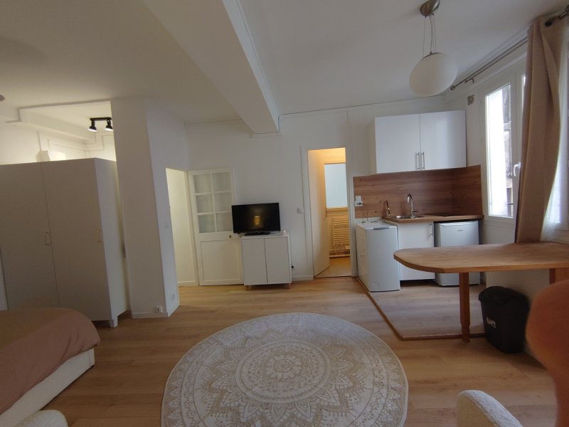 A Paris 2ème, dans la rue Beauregard, rue calme, à proximité immédiate des commerces et des transports ( Bonne Nouvelle/ Sentier/ Reaumur), dans un petit immeuble ancien, au 2ème étage sans ascenseur, un studio de 25m2 avec coin nuit, entièrement refait à neuf, comprenant: Entrée avec rangements, grande pièce de vie avec deux fenêtres et très belle hauteur sous plafond, exposition sur grande cour. Cuisine ouverte équipée (plaques électriques, micro-onde, lave linge, hotte, réfrigérateur). Salle d'eau dotée d'une fenêtre et wc. Parquet. Chauffage et eau chaude électriques. DPE E. Loyer charges incluses: 1250 euros cc (1215+35). Dépôt de garantie: 2430 euros. Honoraires: 375 euros ttc incluant état des lieux d'entrée et de sortie (total de 15 euros ttc/m2).