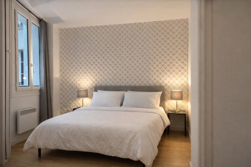 La chambre indépendante, confortable et au calme, bénéficie de rangements intégrés et d'une belle décoration avec tête de lit capitonnée.