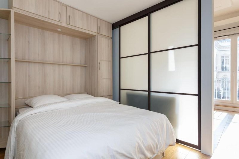 Le studio, lumineux grâce à ses grandes fenêtres donnant sur rue, offre un agencement optimisé et des espaces bien définis.