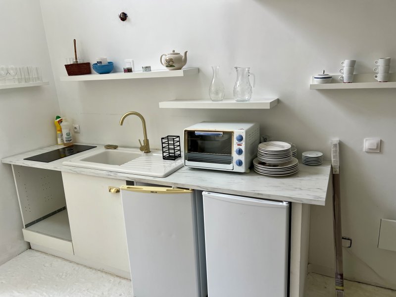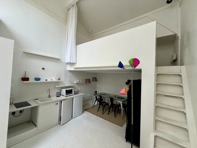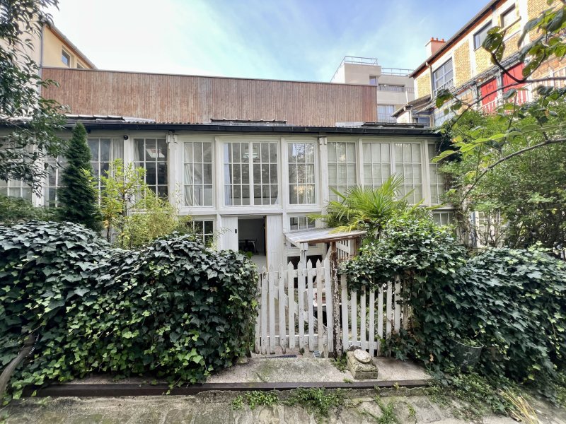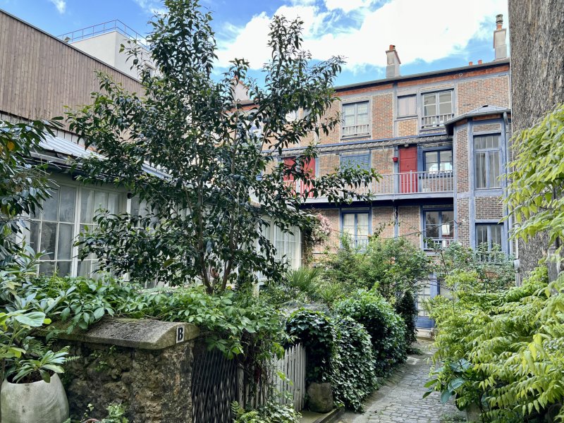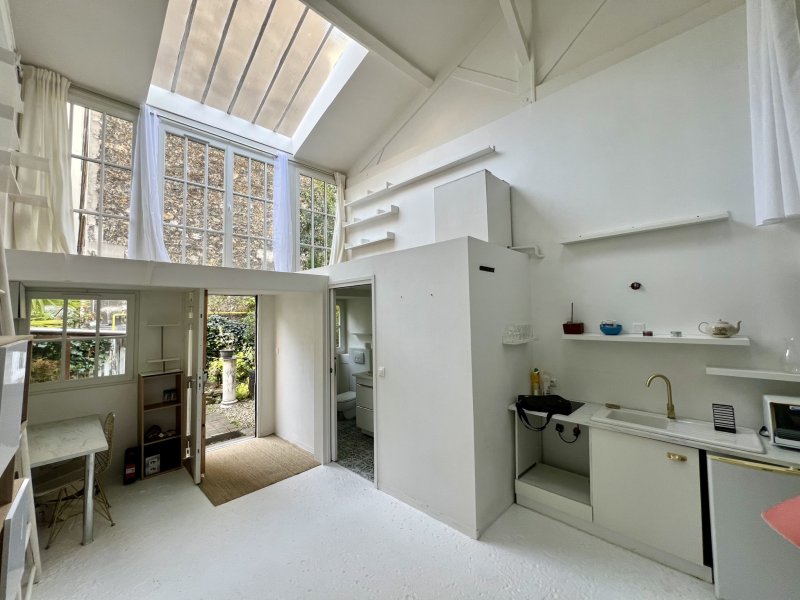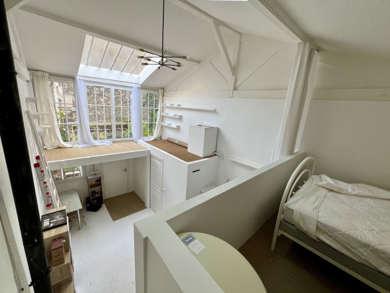 rue Falguière Paris 15, Atelier d'artiste 32m2 avec jardin 5 m2, véritable atelier de sculpteur en rez de jardin, entrée sur séjour-atelier avec cuisine ouverte et mezzanine de couchage 5 m2, sde-wc, très lumineux, sur jardins très calme et lumineux. proche commerces, métro Falguière à 3 minutes, Montparnasse à 5 minutes.