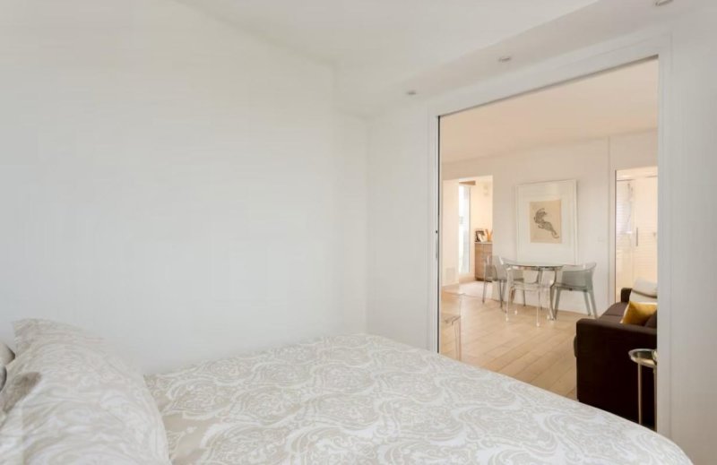 La chambre, confortable et lumineuse, est conçue pour garantir calme et sérénité, avec un accès harmonieux au reste de l'appartement.