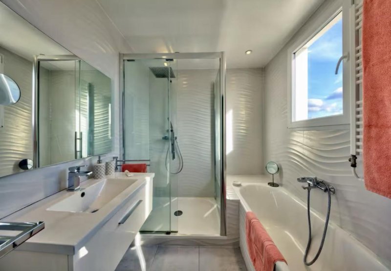 La salle de bain, moderne et bien pensée, allie praticité et élégance avec une baignoire pour se relaxer et une douche pour plus de confort au quotidien.
