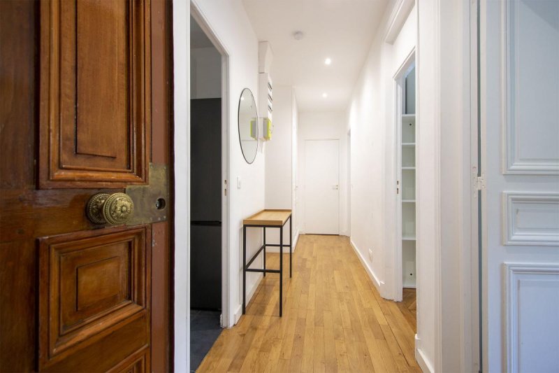 Ce bien traversant, baigné de lumière naturelle, se compose de trois chambres spacieuses, chacune dotée de nombreux rangements intégrés, d'un séjour agréable, d'une cuisine équipée, et de deux salles d'eau - dont une avec douche et baignoire. Parquet en point de Hongrie, moulures et grandes fenêtres apportent beaucoup de charme.