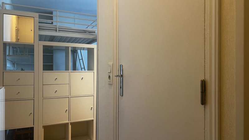 Entrée donnant sur la salle d'eau avec WC (broyeur), grand séjour aménagé avec lit mezzanine, bureau et rangements donnant sur kitchenette équipée (four/ réfrigérateur/ plaque de cuisson/ lave-linge).