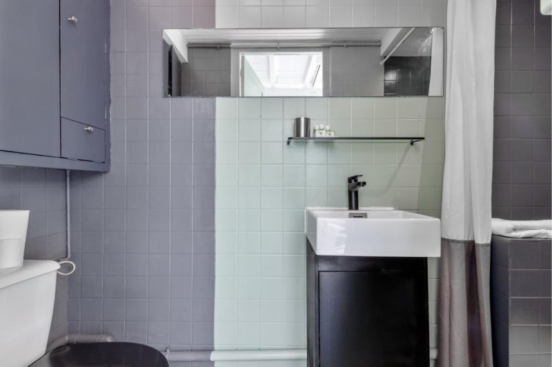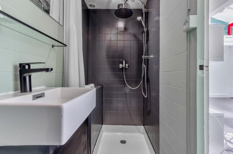 La salle de douche italienne reste épuré et moderne , en accueillant un vasque et un toilette.