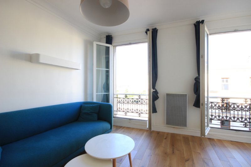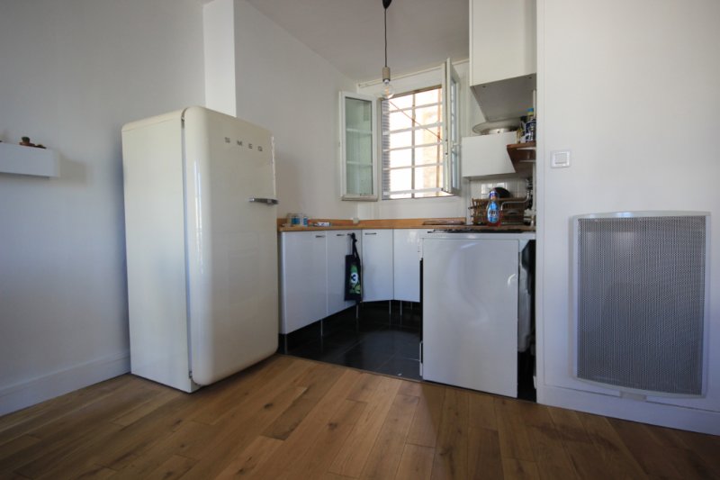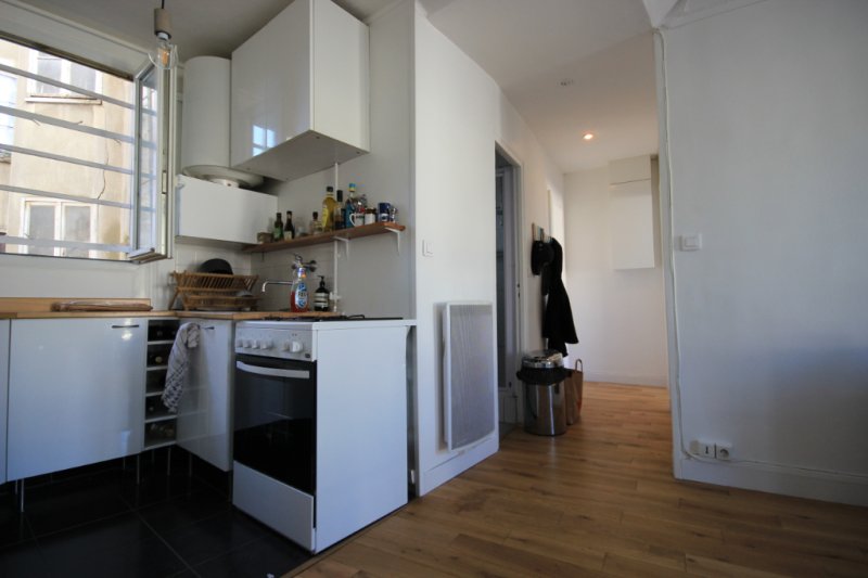 Entrée avec placards, chambre avec lit double, salle d'eau avec WC, cabine de douche et machine à laver, cuisine aménagée et équipée ouverte sur un beau séjour lumineux avec une belle vue sur le Sacré-Coeur.