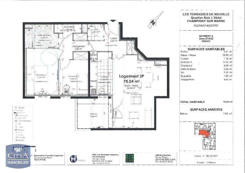 SANS FRAIS d'AGENCE. À louer T3 de 75.04 m², à CHAMPIGNY SUR MARNE dans un immeuble récent avec de belles prestations. Situé au 2ème étage avec ascenseur, il offre un séjour de 26.56 m², un balcon de 7.08m², une cuisine américaine, buanderie, deux chambres, une salle de bain, wc séparé et placards. La résidence bénéficie d'un chauffage et eau chaude collectif. Le bien dispose d'une place de parking en sous sol. Proche des écoles du primaires et du secondaire à moins de 10 minutes du bien. Il y a tous les commerces de proximité .