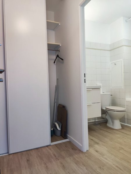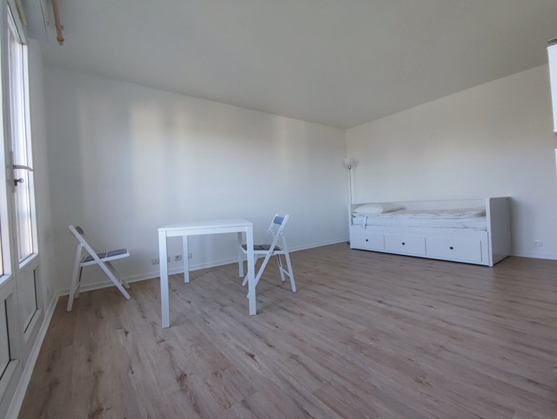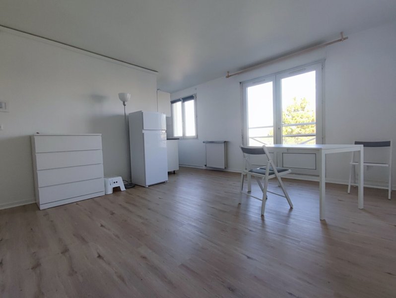 CHATOU EUROPE - 20 mn BUS RER - RÉSIDENCE 1992 sur VERDURE, un grand studio MEUBLE très fonctionnel comprenant : entrée avec placard, séjour de 21 m² (lit banquette, commode, table, chaises) avec coin cuisine aménagée (meubles hauts et bas, évier, 2 plaques induction, micro-ondes, lave-linge, réfrigérateur combiné), grande salle de bains avec WC.
