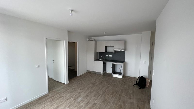 Une entrée, Un séjour lumineux avec cuisine ouverte de 18,80 m², Deux chambres de 11,36 m² et 9 m², Une salle de bains, un WC séparé.