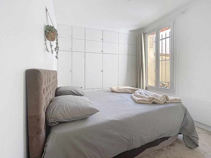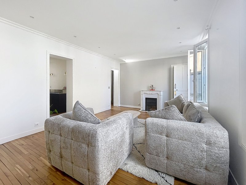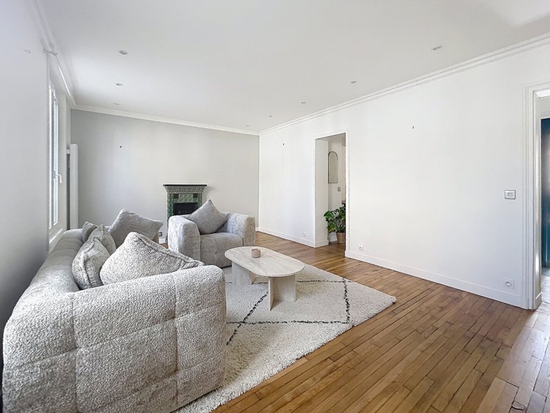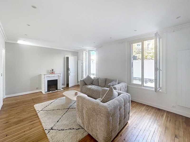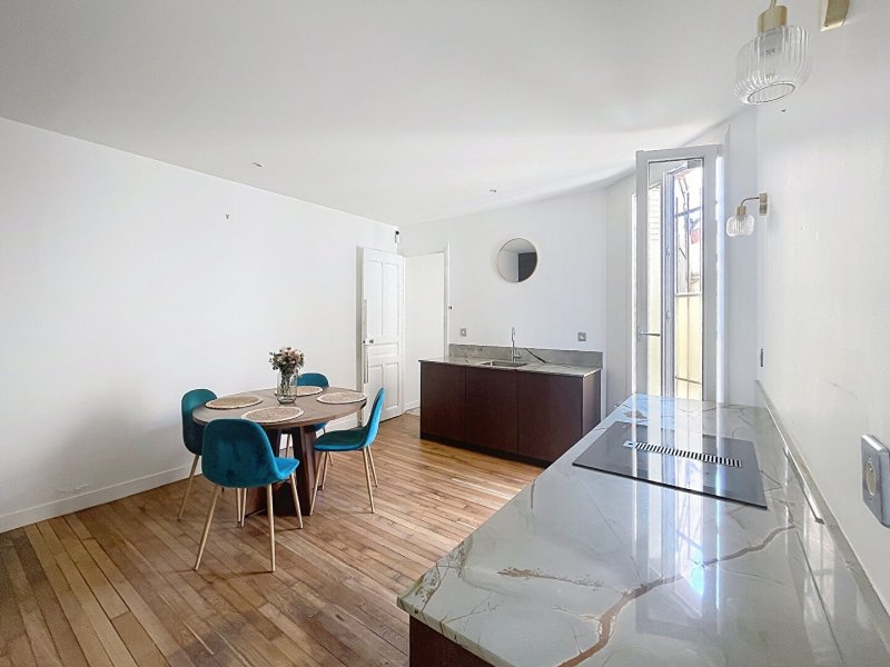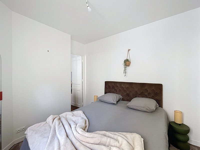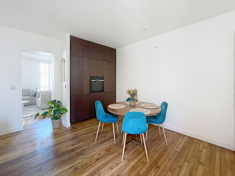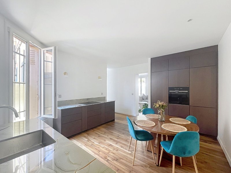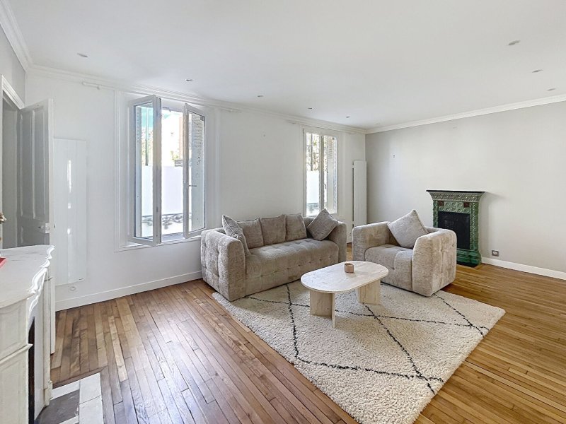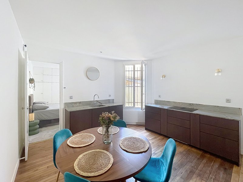 Au rez-de-chaussée d'un bel immeuble 1930, 3 pièces meublé avec sobriété et goût et comprenant entrée, séjour double, cuisine aménagée et équipée avecc espace repas, chambre avec placard, salle de bains, wc séparés avec lave-mains.