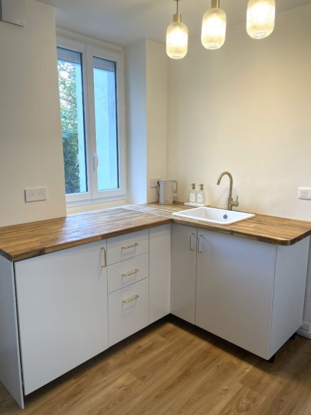 Composé de deux espaces de 8 m2 chacun, il est lumineux et dispose d'un espace d'accueil, d'un espace cuisine et de sanitaires.