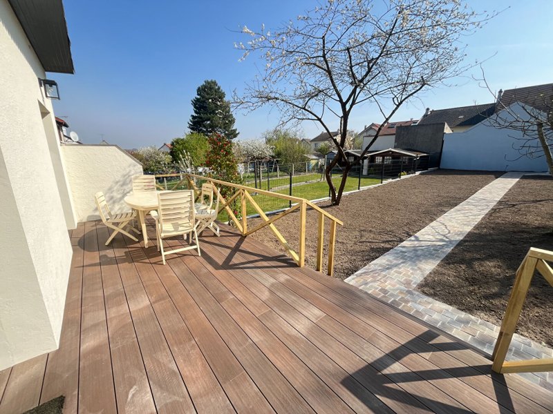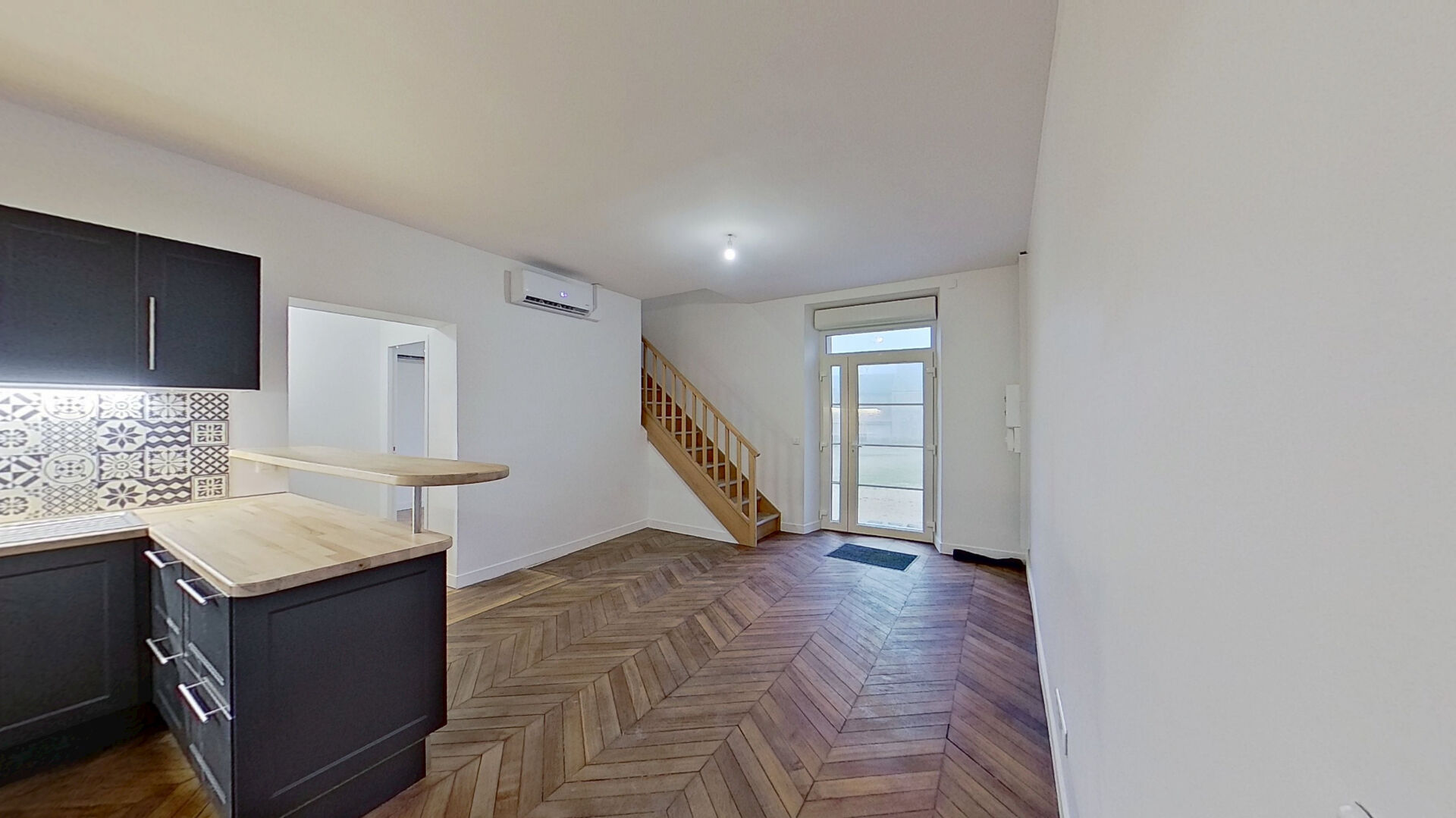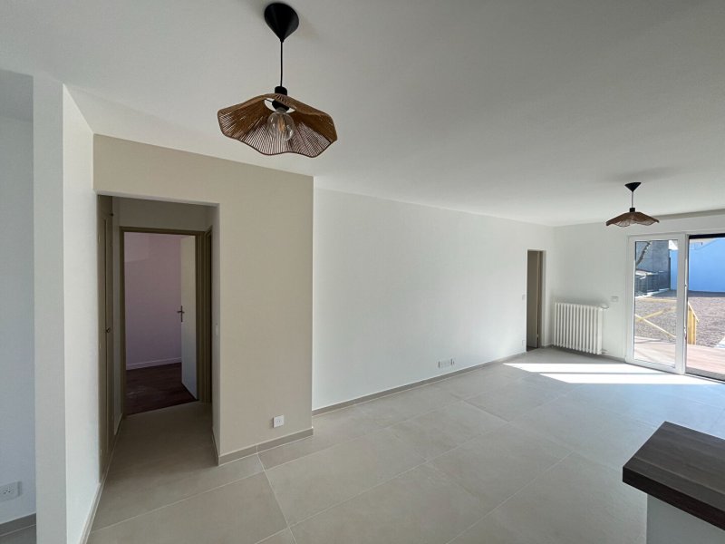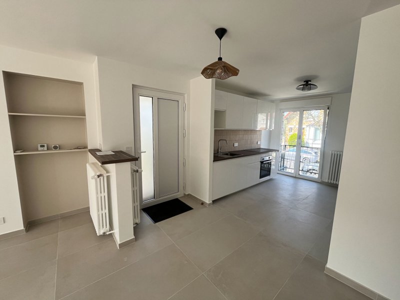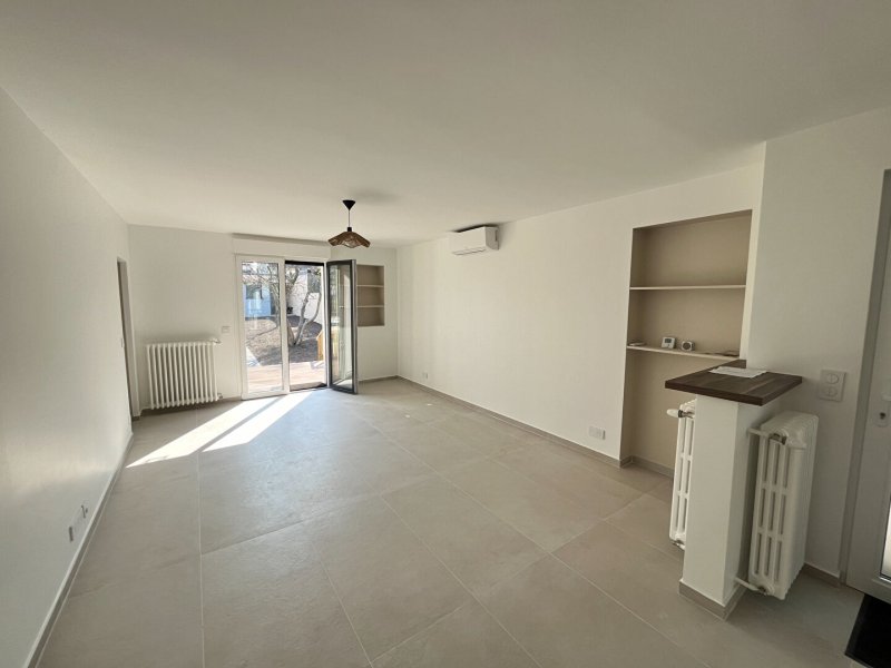 au RDC : un double séjour ENSOLEILLÉ exposé SUD-EST avec accès direct sur la TERRASSE de 20m² et le JARDIN, une cuisine totalement ÉQUIPÉE ET AMÉNAGÉE (four, lave-vaisselle, plaques chauffantes), deux chambres AVEC PLACARDS (dont une avec accès sur la terrasse) ainsi qu'une une salle d'eau avec WC.