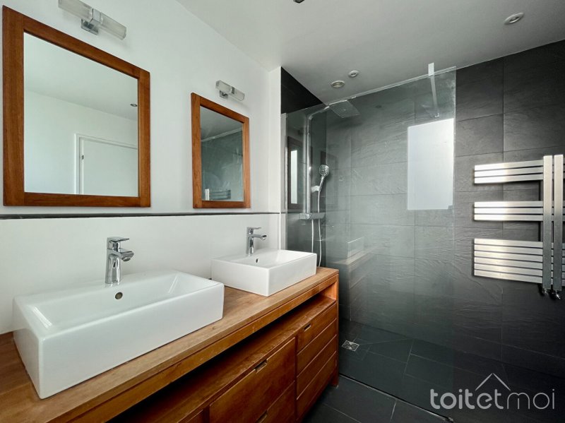 A l'étage, elle offre 4 chambres dont une suite parentale avec salle d'eau et WC, et une salle de bains avec WC. Les combles sont aménagés, pour une surface au sol de 48m² (non comprise dans la surface habitable) : idéal pour une salle de jeux ou du stockage.