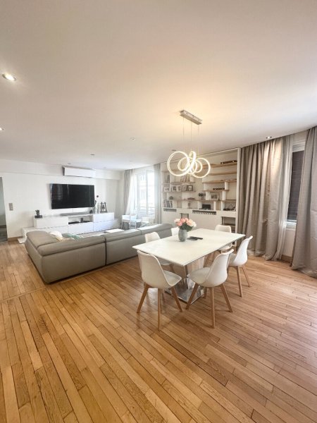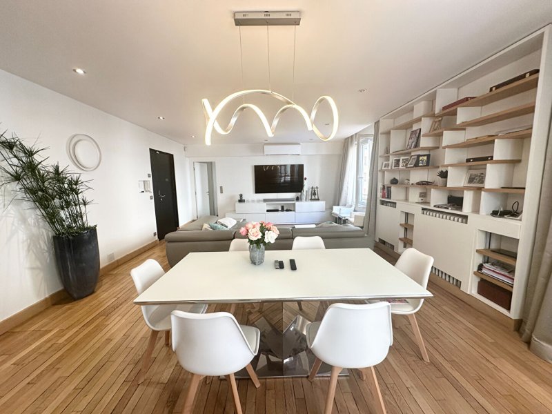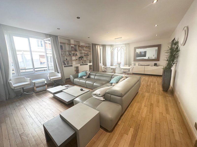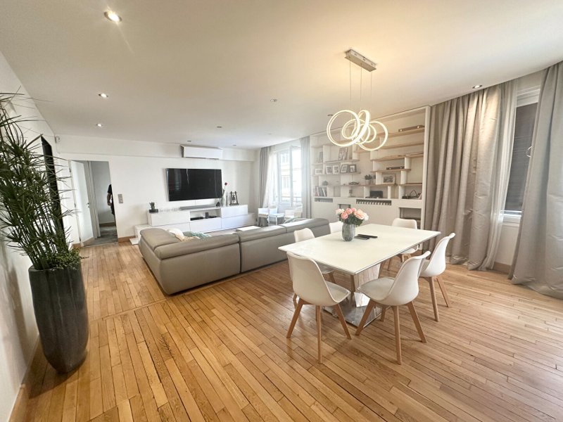 Beau 5 pièces de 163.02m² au 1er étage avec ascenseur (Seul appartement de l'étage) comprenant : Une entrée, un double séjour en angle lumineux exposé EST, une grande cuisine dinatoire aménagée et équipée, une suite parentale avec dressing et salle de bains privée, 3 chambres avec salle d'eau, une buanderie, 3 W.C séparé et 2 caves en sous-sol.