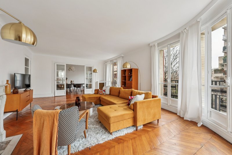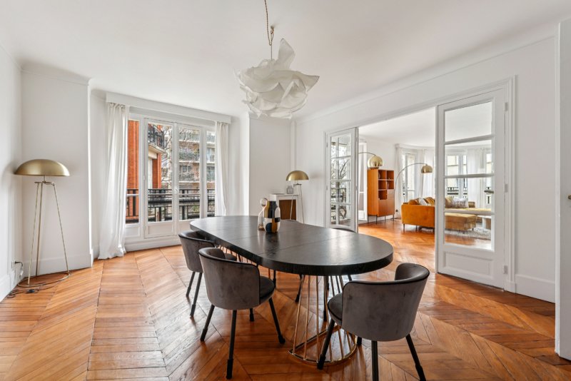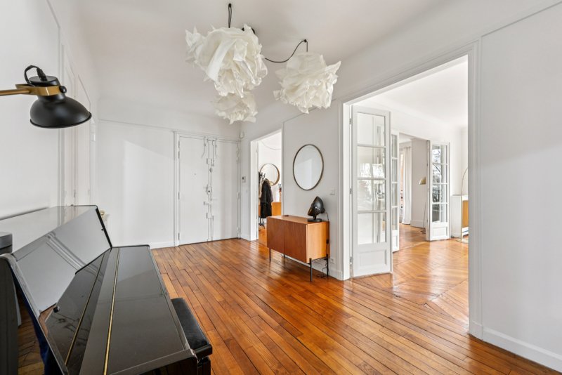 L'appartement se compose comme suit : une vaste entrée, est une triple réception en enfilade de plus de 62 m², un salon en rotonde avec cheminée et de grandes ouvertures vers les jardins de la Villa de la Réunion et de la Villa Molitor. L'espace nuit comprend 4 chambres avec 2 salles de bains et des toilettes séparés qui ont fait l'objet d'une rénovation qualitative.