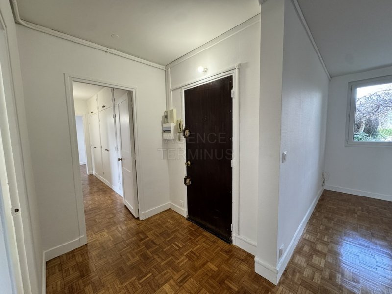 ENGHIEN LES BAINS à quelques pas du marché, 6 minutes à pied du centre-ville et du lac. Quartier des thermes, dans belle résidence en pierre de taille, appartement en rez-de-chaussée surélevé offrant: entrée, séjour, cuisine, dégagement et wc, couloir avec grands placards, deux chambres, salle de bains. Cave et garage. Chauffage collectif