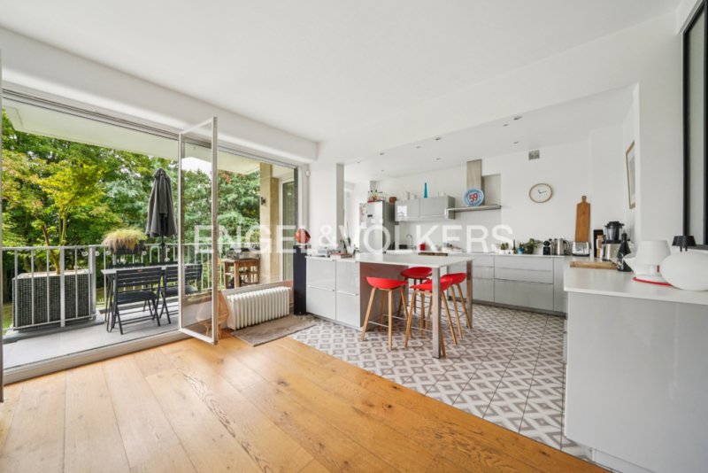 L'appartement s'ouvre sur une entrée avec toilettes invités, lave-mains et buanderie. Il offre un vaste espace de vie de plus de 54 m², lumineux et traversant, comprenant un séjour avec cuisine ouverte, le tout prolongé par une belle terrasse de 16 m², ensoleillée et donnant sur un magnifique parc arboré, sans aucun vis-à-vis.