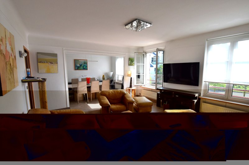 Entrée avec penderie menant à un lumineux séjour/salle à manger de 33,5 m², cuisine indépendante rénovée, spacieuse, d'environ 15 m², deux belles chambres, dont une avec placard intégré, salle d'eau moderne et WC séparés en excellent état.