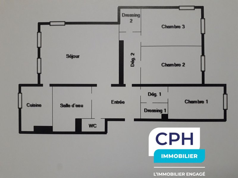 L'appartement se compose d'une entrée, de trois chambres, d'un séjour double lumineux, d'une cuisine indépendante, d'une salle de bains, de WC séparés ainsi que d'une cave.