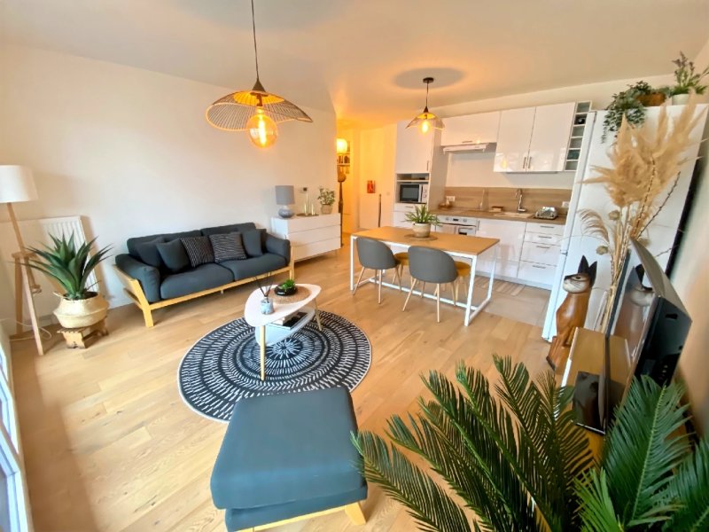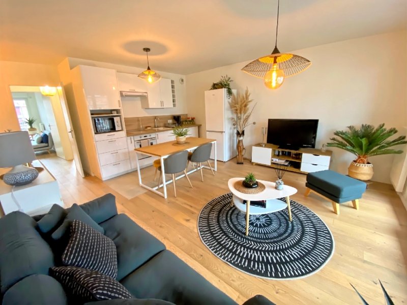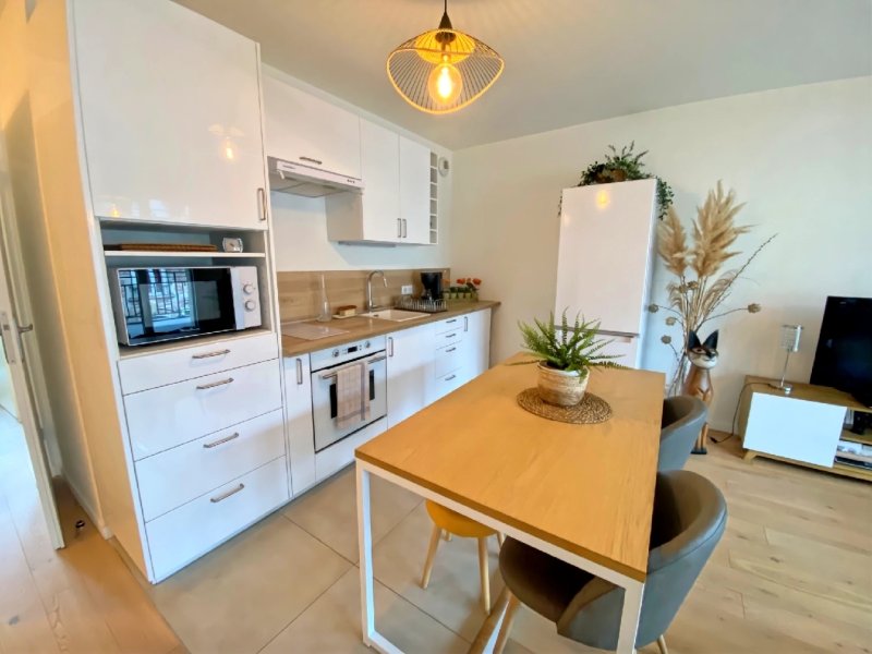 DESCRIPTIF DE CET APPARTEMENT À VENDRE : Entrée, Cuisine aménagée et équipée ouverte sur Séjour avec accès Terrasse, 2 Chambres, Salle deau (Douche à litalienne), W-c séparé. CET APPARTEMENT DISPOSE EGALEMENT : dune place parking et Terrasse (cote rue et jardin de 7.70 m²).