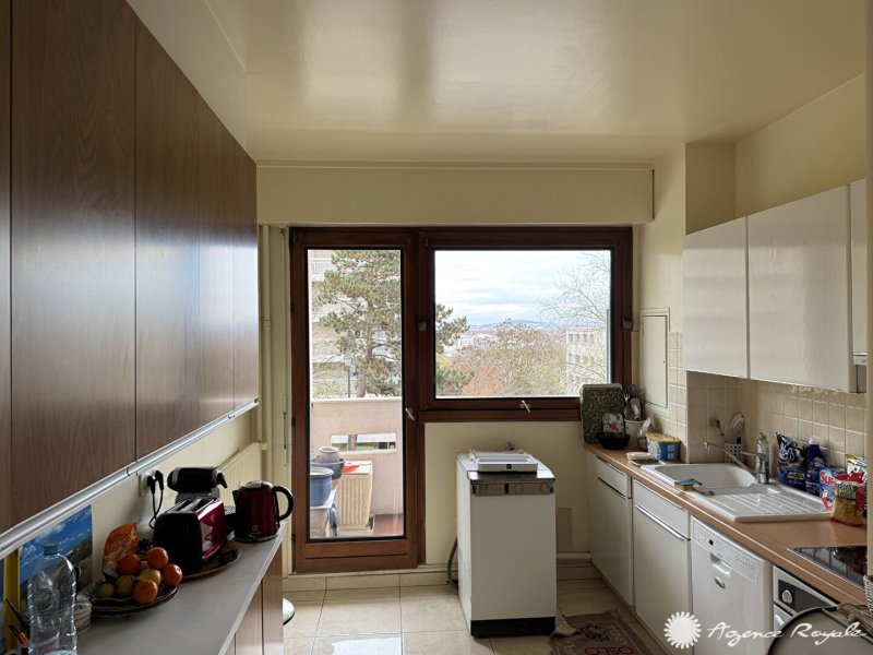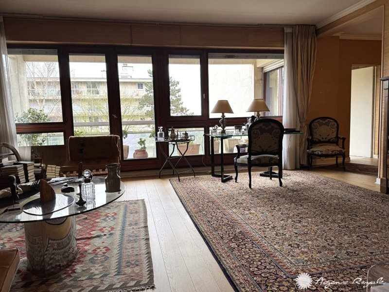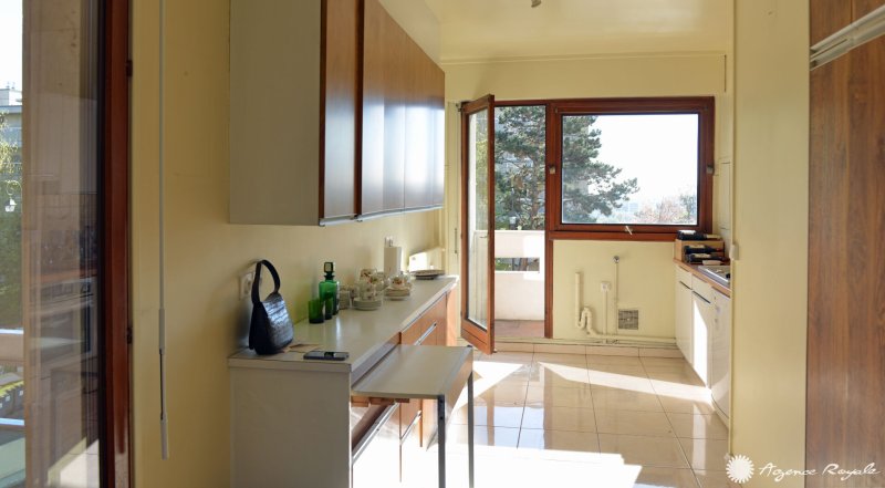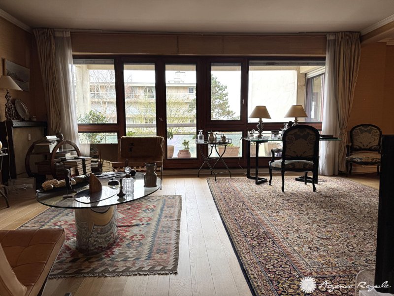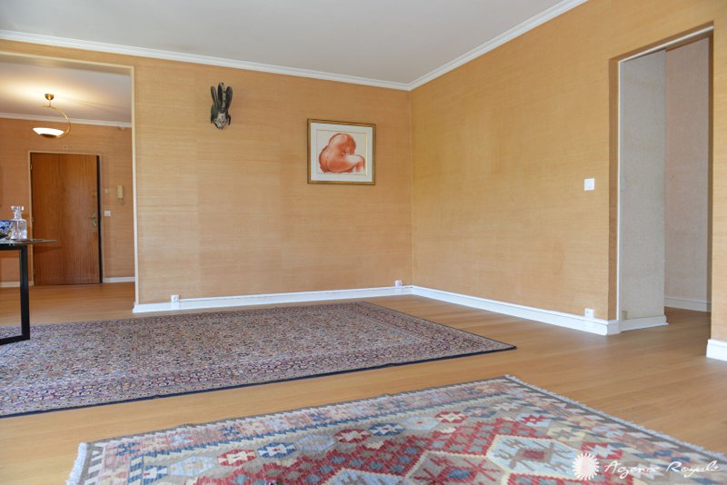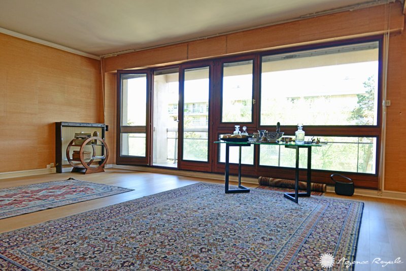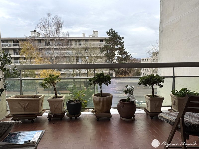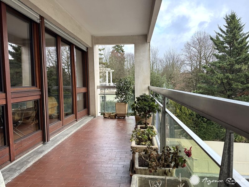 Dans Résidence de standing avec ASCENSEUR, Appartement de 98,99m² avec beau BALCON-TERRASSE : Entrée avec placard, Séjour avec parquet sur TERRASSE de 11m², Grande Cuisine équipée sur BALCON et TERRASSE, 2 Chambres avec vue sur jardin, Dégagement avec 3 placards, Cave et 2 PARKINGS. Environnement calme et résidentiel en limite de Saint Germain en Laye.