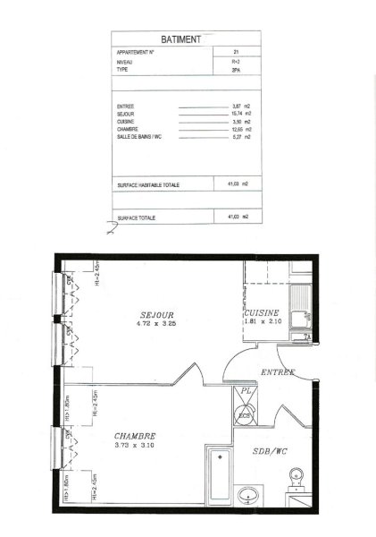 Dans résidence de standing récente, appartement 2 pièces de 41m² au dernier étage (2ème étage avec ascenseur) comprenant entrée, cuisine, séjour, chambre avec rangement, salle de bains avec wc.