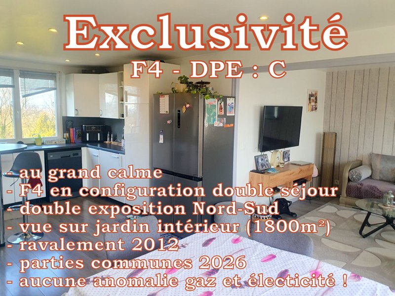 Dans une paisible petite résidence, appartement de type F4 situé au troisième étage (sans ascenseur) offrant : une entrée, une pièce principale avec double séjour et cuisine ouverte entièrement aménagée exposée Sud bénéficiant d'une vue sur le grand jardin intérieur privé, et d'un demi balcon, 2 chambres (mais 3 possibles aisément), une salle d'eau avec coin laverie (fenêtre ouvrable), et des toilettes séparées. Mais aussi, un chauffage individuel au gaz, des fenêtres et porte-fenêtre en double vitrage, des volets motorisés, des murs extérieurs isolés par l'intérieur, une grande cave privative (12m²), une place de stationnement attitrée dans un parking intérieur sécurisé par porte motorisée, un grand jardin intérieur (1800m² !), un ravalement fait en 2012, des parties communes refaites entièrement en 2021, de faibles charges, et aucune anomalie en gaz et en électricité... NE PAS RÉFLÉCHIR TROP LONGTEMPS ! Contactez bruno ROCCO au 06 23 29 19 14. DPE : C -- GES : C date de réalisation : 07/04/2025 Estimation du coût annuel de l'énergie : 870Euro à 1220Euro/ an (prix de l'énergie considéré sur 2021-2022-2023. Nombre de lots total :120 lots (60 lots appart. 60 lots caves), charges 194Euro/mois (soit 2336Euro/an, comprenant: eau froide individuelle (ici pour 4 personnes), entretien et électricité des parties communes, entretien des espaces verts, sortie des poubelles, et syndic professionnel).