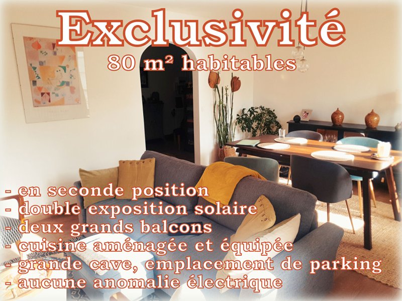 Dans une paisible petite résidence entièrement sécurisée (clôture, digicode et portail voitures motorisé), vaste appartement de type F4 au calme absolu d'une seconde position, bénéficiant d'une double exposition solaire Est/Ouest, offrant sur 80m² habitables : une grande entrée (13m²) un double séjour exposé Ouest ouvrant sur un balcon filant, une cuisine entièrement aménagée et équipée ouvrant sur un autre balcon filant, deux grandes chambres (non contiguës) de 11 et 14m², une salle d'eau contemporaine (avec fenêtre) avec cabine de douche grand format, et des toilettes séparées. Mais aussi, du double vitrage, un tableau électrique à disjoncteurs électroniques, une vraie grande cave de 9m² (avec accès facile par plan incliné, idéal par exemple pour ranger ou sortir d'éventuels vélos électriques "un peu" lourds), une place de stationnement privative, et des parties communes intérieures refaites en 2016. BEAUCOUP D'ESPACE DE CALME ET DE LUMIÈRE ! Contactez bruno ROCCO : 06 23 29 19 14. DPE : E ~ GES : E (12/09/2025) estimation du coût annuel de l'énergie : 1900Euro à 2640Euro (prix moyen de l'énergie sur 2012-2022-2023). Nbre de lots de la copropriété : 72 lots (dont 24 logements), charges 279Euro/mois, ici pour une personne (soit 3341Euro/ an), comprenant : le chauffage, l'eau froide, l'eau chaude entretien et électricité des parties communes intérieures et extérieures, sortie des poubelles, et syndic professionnel. A noter : présence de compteurs individuels d'eau.