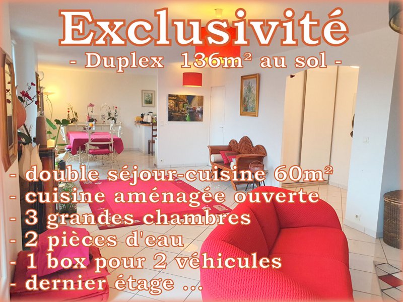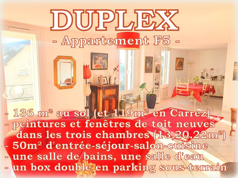 À moins de 100 m des commodités appréciées du rond-point du plateau (commerces, écoles, bus, parc départemental ...) au deuxième étage d'une paisible résidence de standing particulièrement verdoyante, appartement de type F5 en duplex offrant sur plus de 136m² au sol : un espace ouvert de 50m² exposé Sud (balcon 3m²) avec une cuisine entièrement aménagée semi-ouverte, et des toilettes avec lave mains et coin laverie. Dans la partie duplex, un dégagement, trois chambres ( 12,20, et 22m² ) avec dans chacune d'entre elles de grands placards aménagés intégrés, des peintures neuves (sols et plafonds) , des fenêtres de toit neuves également, une salle de bains , une salle d'eau avec toilettes, et un espace de stockage de 6m² en sous-pente.Mais aussi, du double vitrage à chaque fenêtre, un chauffage individuel électrique, et un double box sécurisé en sous-sol .