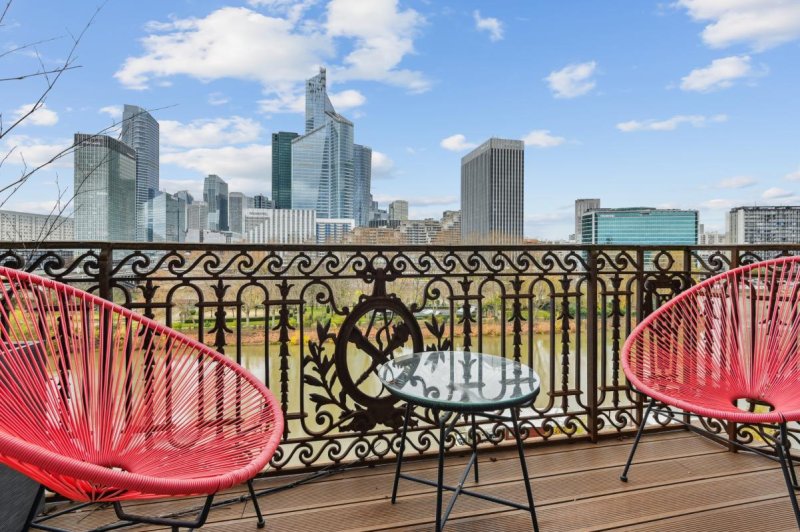 Un grand balcon laisse place à une vue spectaculaire sur la Seine et La Défense .