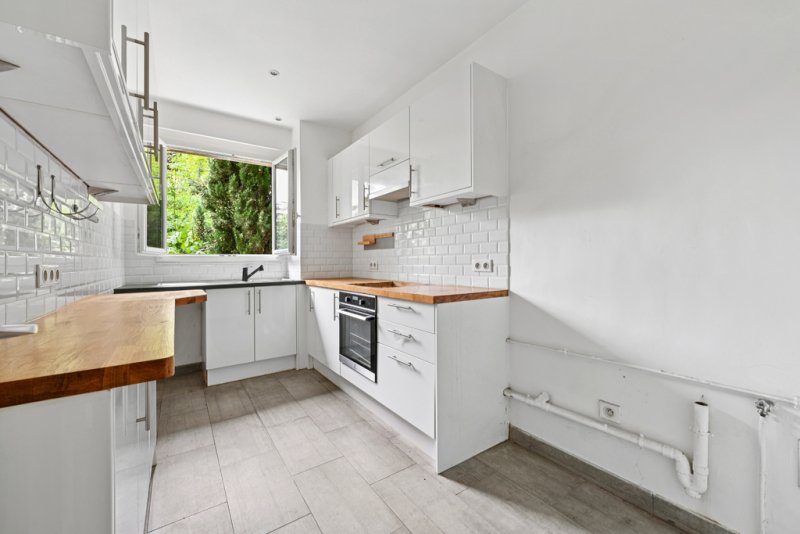 Il dispose de deux chambres lumineuses et calmes, donnant sur un bel espace de verdure. La cuisine séparée est fonctionnelle et bien agencée.