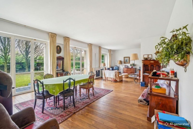L'entrée dessert une élégante triple réception de 51 m², largement ouverte sur un vaste jardin arboré, véritable prolongement du séjour. La cuisine indépendante s'inscrit dans un ensemble entièrement modulable, offrant de nombreuses possibilités de réaménagement.